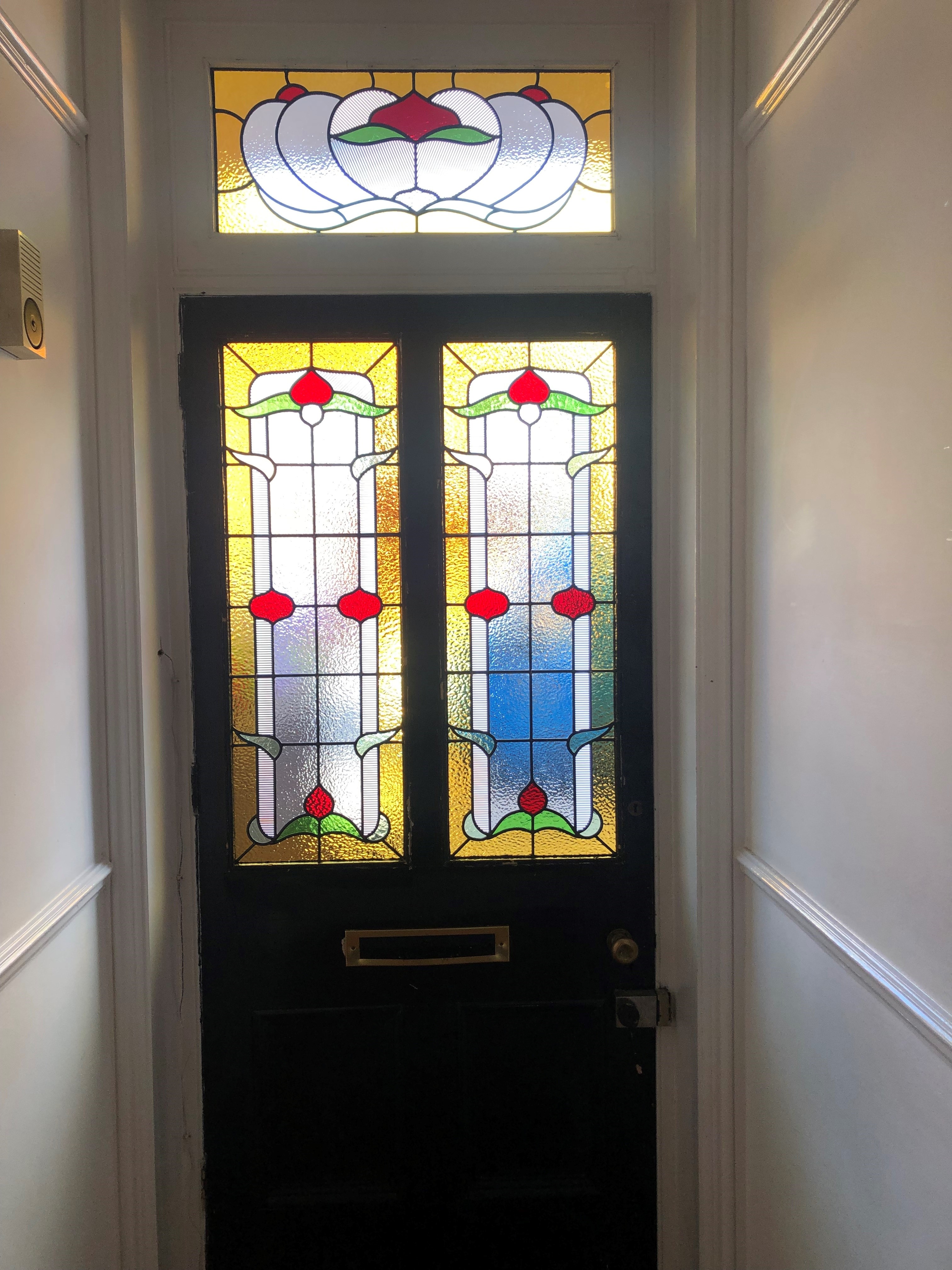 Decorative coloured glass is cut to size to suit the picture or arrangement.